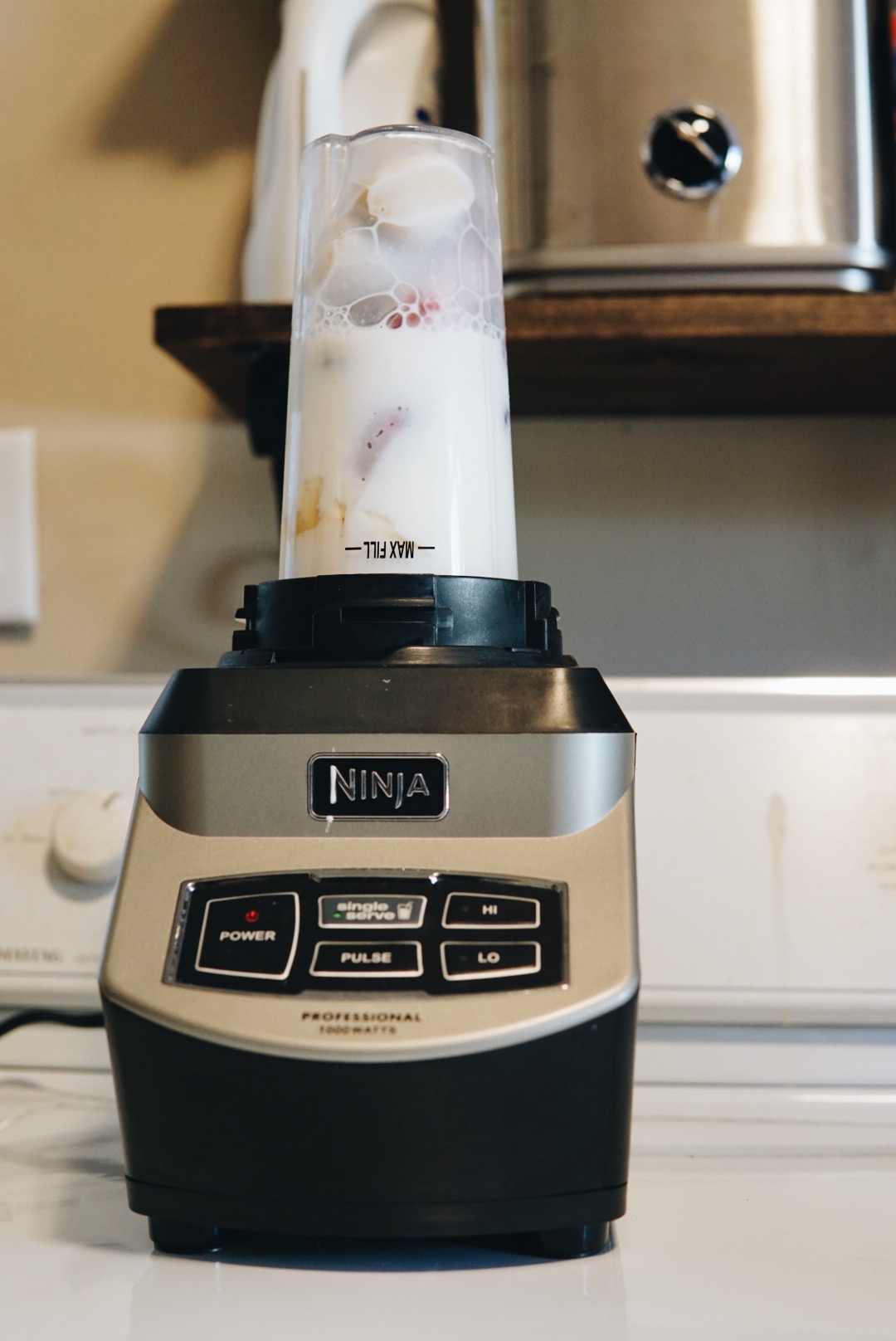 These glorious smoothies couldn’t be any easier to make! We normally put the ingredients into the cup in the following order: banana, berries, milk, honey, yogurt (not sure if this makes much of a difference, though). I blend this thoroughly, for about 20 seconds to get the berry seeds as small as possible.