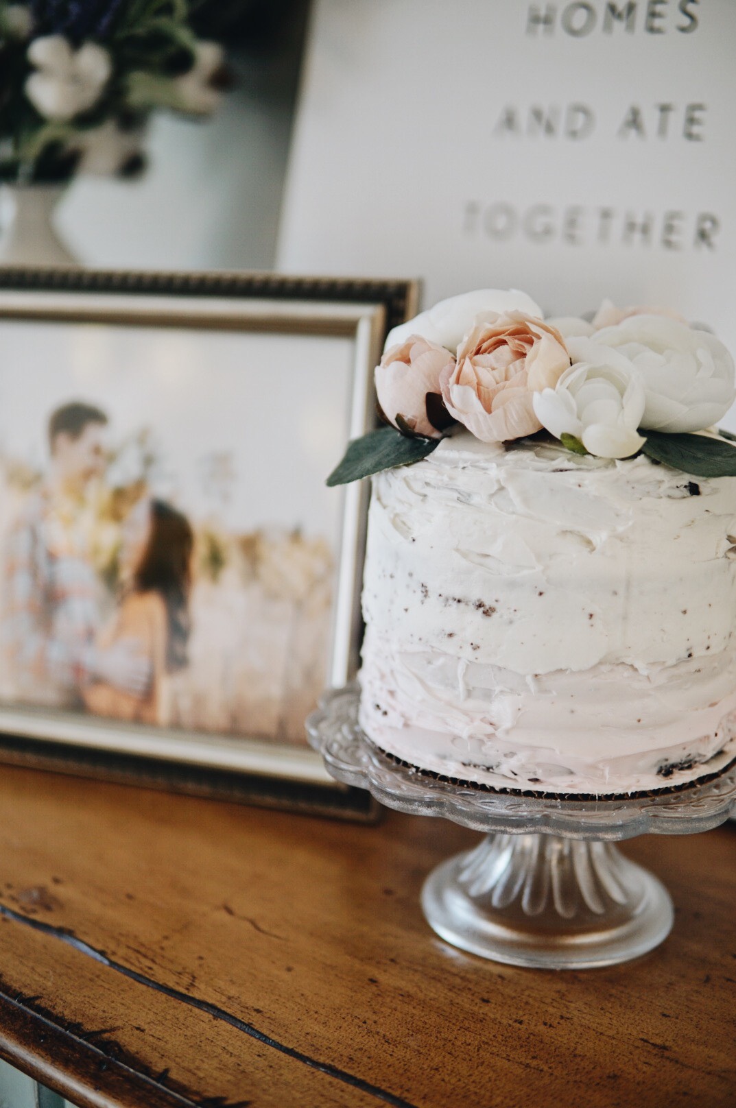 The possibilities for shower desserts are endless. Cupcakes in the shape of an engagement ring. Chocolate covered strawberries. Cakes, cookies, homemade ice cream cake! I suggest asking the bride about her favorite sweets and trying to incorporate at least one thing special for her. Cookies and Rice Krispy treats are easy and always a crowd-pleaser, so we stuck to those for our brunch time shower desserts. I also made a little ombre cake which was mostly for decoration (we had plenty of food) and I sent it home with the bride.