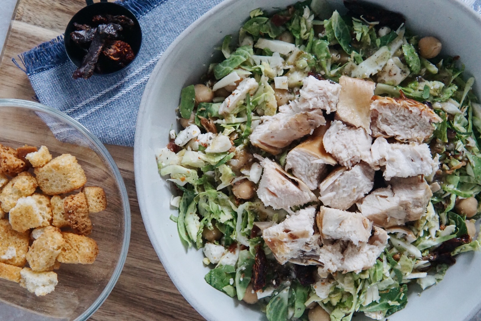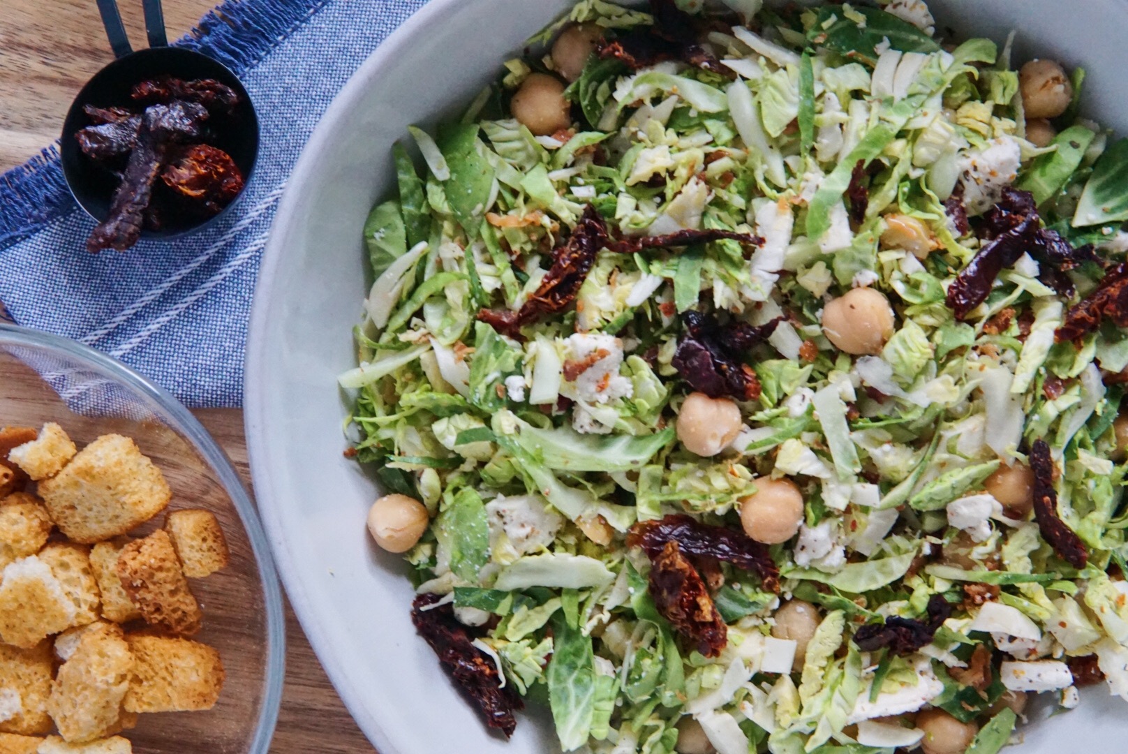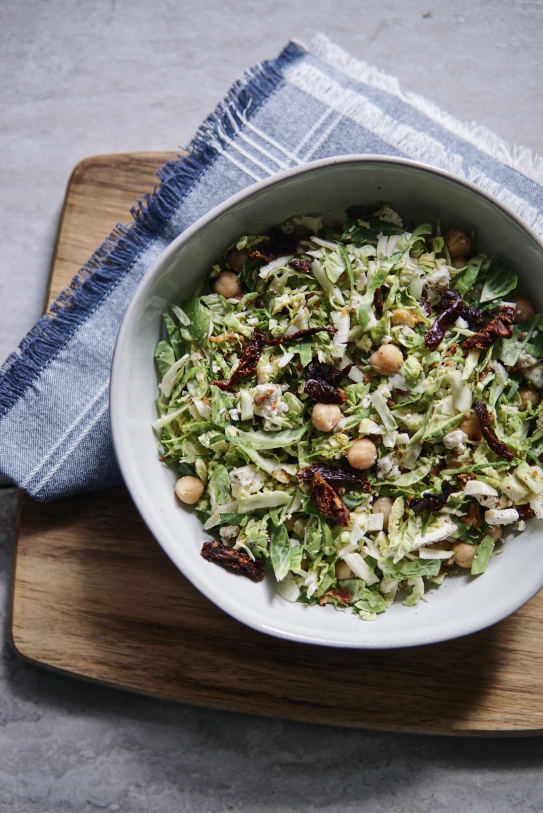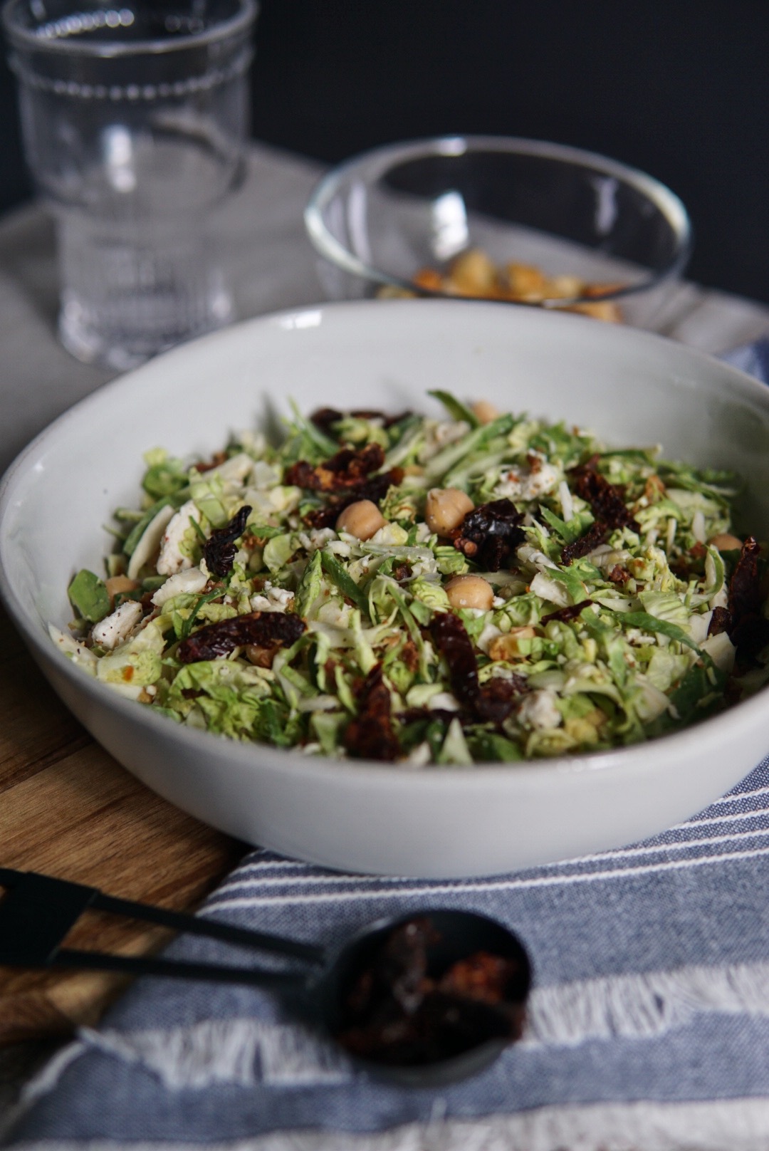 Happy weekend, everyone! I’m excited to share a new salad recipe today that was fun to work on because it involves Brussels sprouts… and I love Brussels sprouts. I’m all for trying new combinations for salads, so when I saw a shredded Brussels sprouts salad on Pinterest, I knew I had to make my own combo! This salad only uses Brussels sprouts, chickpeas, feta, crumbled bacon, and sun-dried tomatoes, and you can easily add other ingredients you like to make this more suitable for you.